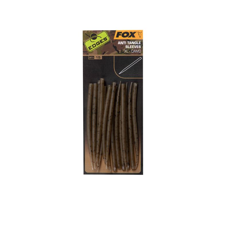 Los Fox Edges XL Anti-Tangle Sleeves (Manguitos XL Antienredos) en color camuflaje son accesorios terminales extra largos diseñados para prevenir enredos y optimizar la presentación del bajo de línea.