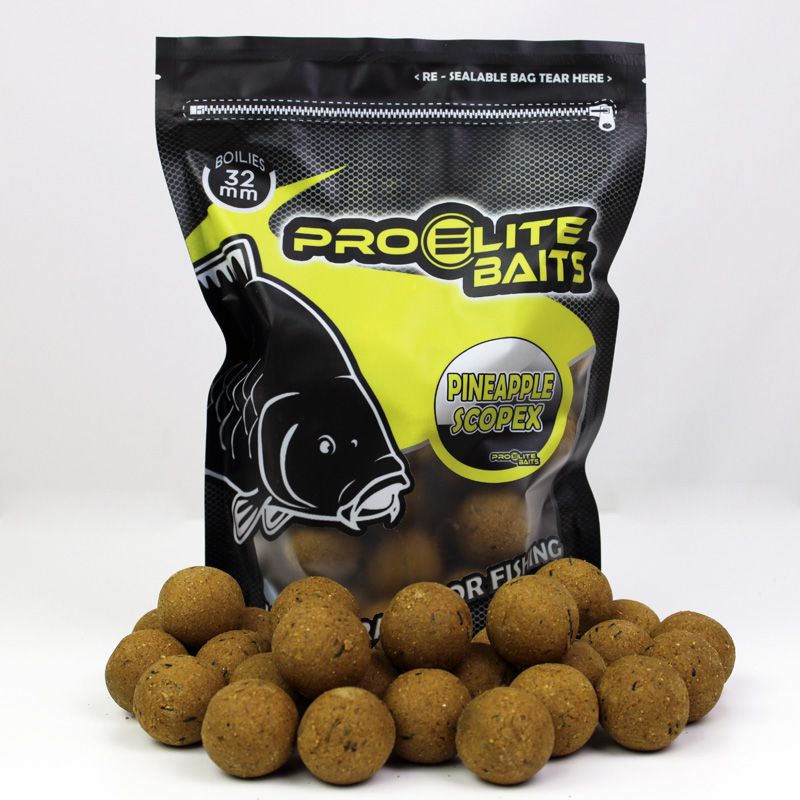 Los Boilies 32mm Pineapple Scopex de ProElite Baits representan la combinación reina de los aromas dulces para la pesca de grandes ejemplares. Este diámetro «gigante» está pensado para pescadores que buscan seleccionar las capturas más importantes, evitando que los peces pequeños o el «minit» arruinen la postura.