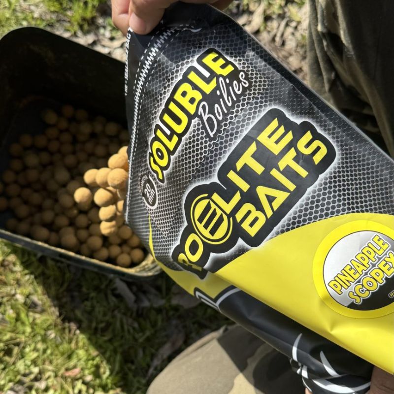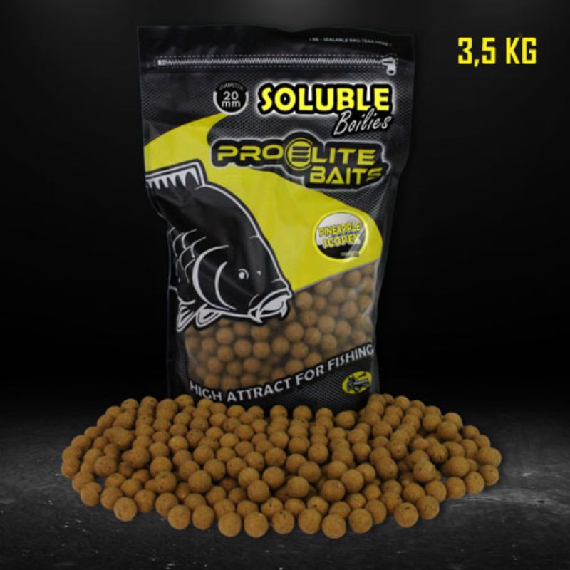 Los Boilies Solubles Pineapple & Scopex 20mm de Pro Elite Baits en formato de 3,5 kg son cebos de alta atracción inmediata diseñados para disolverse progresivamente, liberando una señal aromática constante sin saciar a los peces.