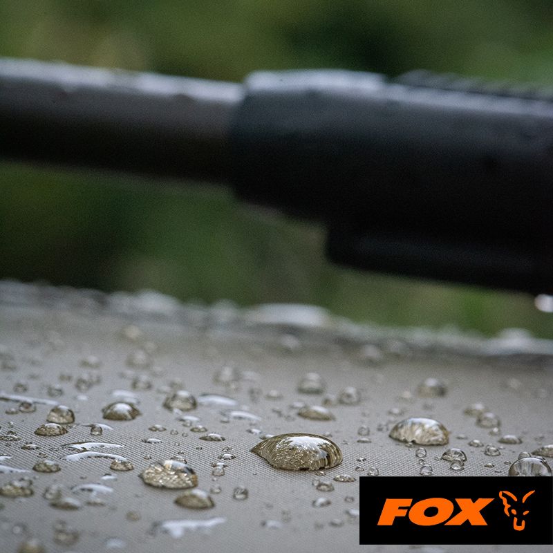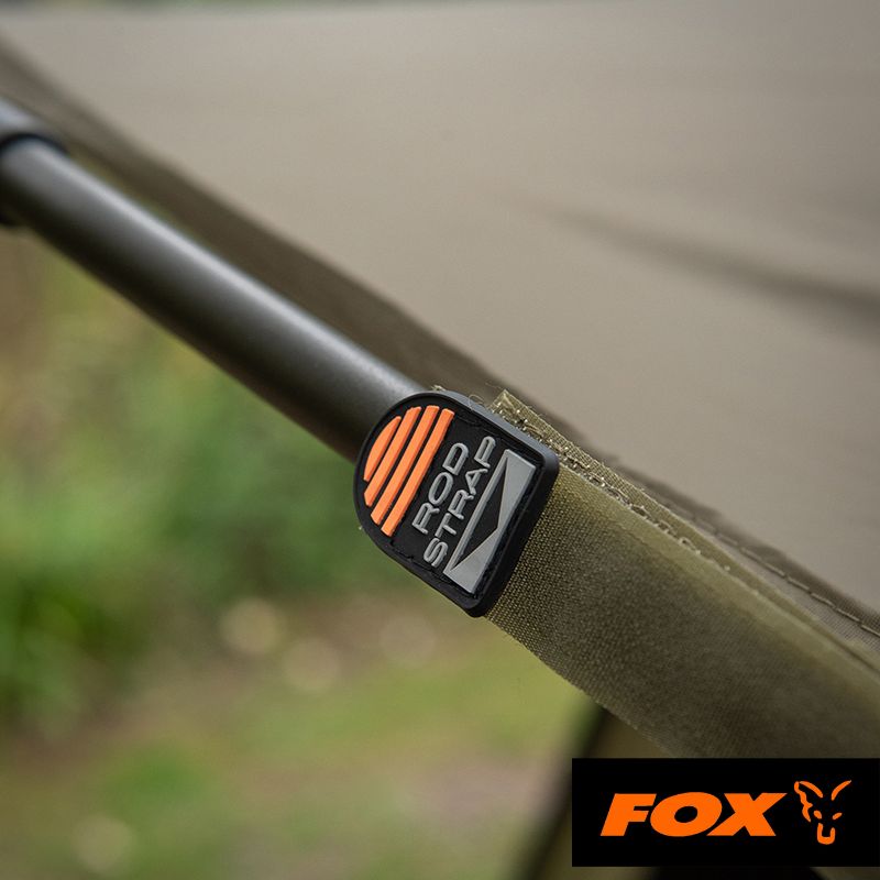 Tela color caqui con marco verde, más dos correas de varilla en la parte delantera del refugio.