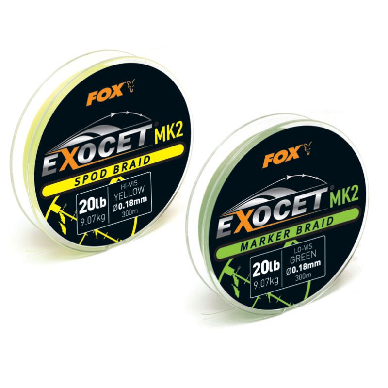 La línea trenzada Fox Exocet MK2 Spod & Marker Braid de 20lb y 300m en color amarillo es un hilo ultra flotante con elasticidad casi nula, diseñado para lances a larga distancia y para el sondeo de fondos.
