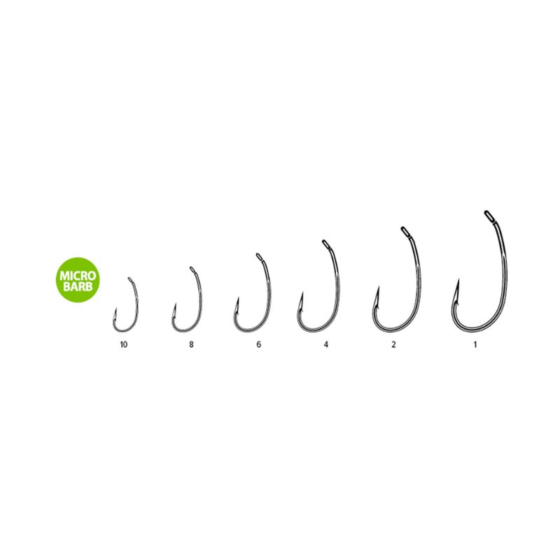 Curvatura Media: Combina las ventajas de los anzuelos de tija corta y larga. Esta geometría permite que el anzuelo gire de forma extremadamente rápida en cuanto el pez toma el cebo.
