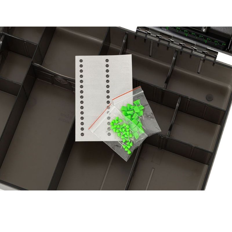 Almacenamiento de Piezas Pequeñas: La tapa incorpora 25 compartimentos individuales de diferentes tamaños, cada uno con una tapa abatible transparente, perfectos para guardar de forma segura y visible elementos pequeños como giratorios, tubos termorretráctiles, clips de plomo y Heli-Safes.