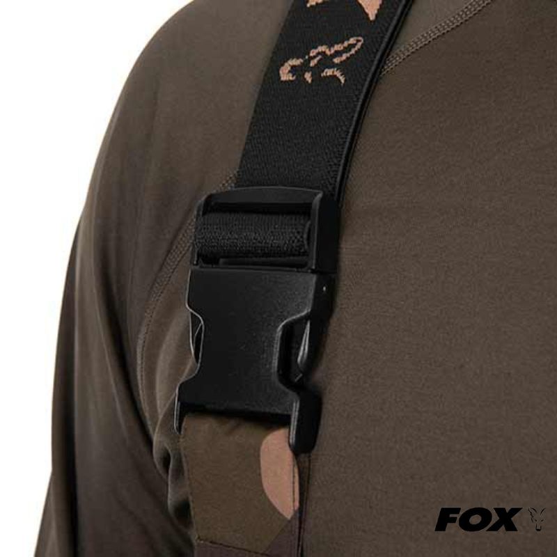 Los petos cuentan con tirantes elásticos con la marca Fox y hebillas de liberación rápida y cintura parcialmente elástica